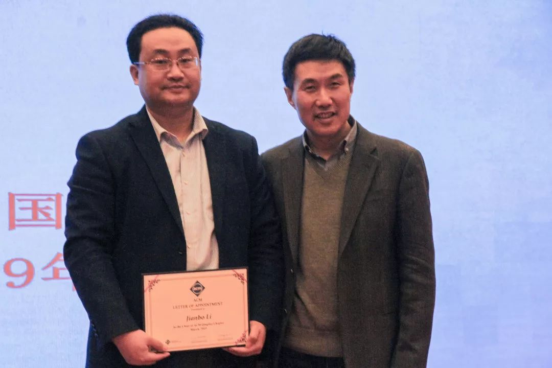 李向阳主席宣读了青岛分会组织架构名单,并与陈文光主席为青岛分会成员颁发聘书。中国海洋大学信息科学与工程菠菜网 副院长董军宇教授、我校十大菠菜网导航 院长李建波教授当选为ACM青岛分会共同主席。