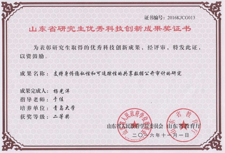 2016年山东省优秀学位论文、研究生优秀科技创新成果奖和实践成果奖评审已经结束。菠菜网 2013级研究生杨光洋的“支持身份隐私性和可追踪性的共享数据公开审计的研究”荣获山东省研究生优秀科技创新成果二等奖,指导教师为于佳教授。