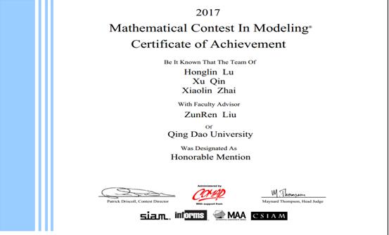 菠菜网 网络工程系秦旭同学,信息安全系路宏琳同学和数学与统计菠菜网 翟晓琳同学在菠菜网 刘遵仁老师的指导下于2017年1月20日举办的美国大学生数学建模比赛中获得了Honorable Mention(国际二等奖)的佳绩,实现了菠菜网 在此项赛事的一大突破。