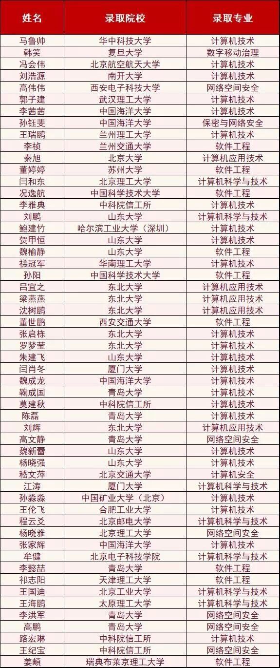 随着2018年研究生录取结果陆续公布,截止目前,菠菜网 共52名学子被录取为硕士研究生,占菠菜网 应届毕业生总人数的26.8%,再创佳绩!其中信息安全专业19人,占本专业人数的48.72%;网络工程专业11人,占本专业人数的26.19%;计算机科学与技术专业17人,占本专业人数的20.48%,物联网专业5人,占本专业人数的16.67%。被北京大学、北京航空航天大学、复旦大学、厦门大学、山东大学和中国海洋大学等985、211高校录取的学生占比约73%。