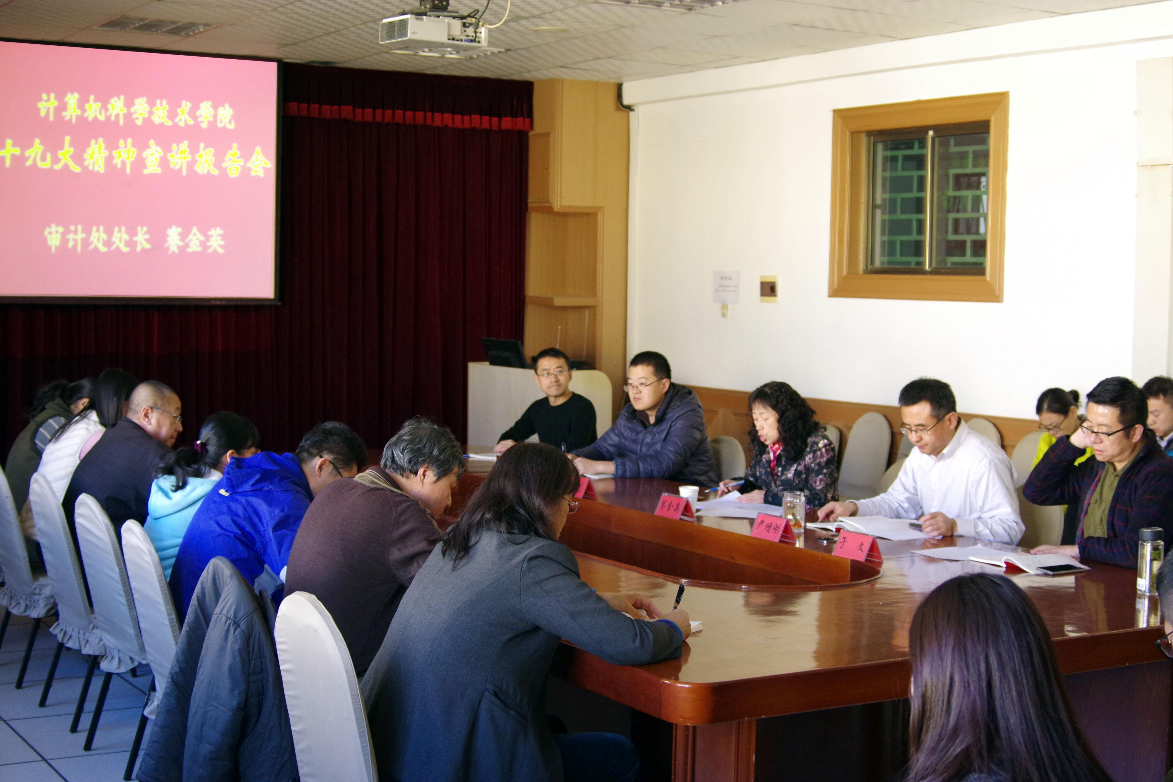 12月8日下午,校审计处处长、校十九大精神宣讲团成员赛金英同志到菠菜网 宣讲党的十九大精神。院领导、有关教学系(中心)支部党员、学生支部党员及院机关全体工作人员等50余名同志在博知楼510会议室听取了宣讲报告。院党委书记尹增刚同志主持宣讲报告会。