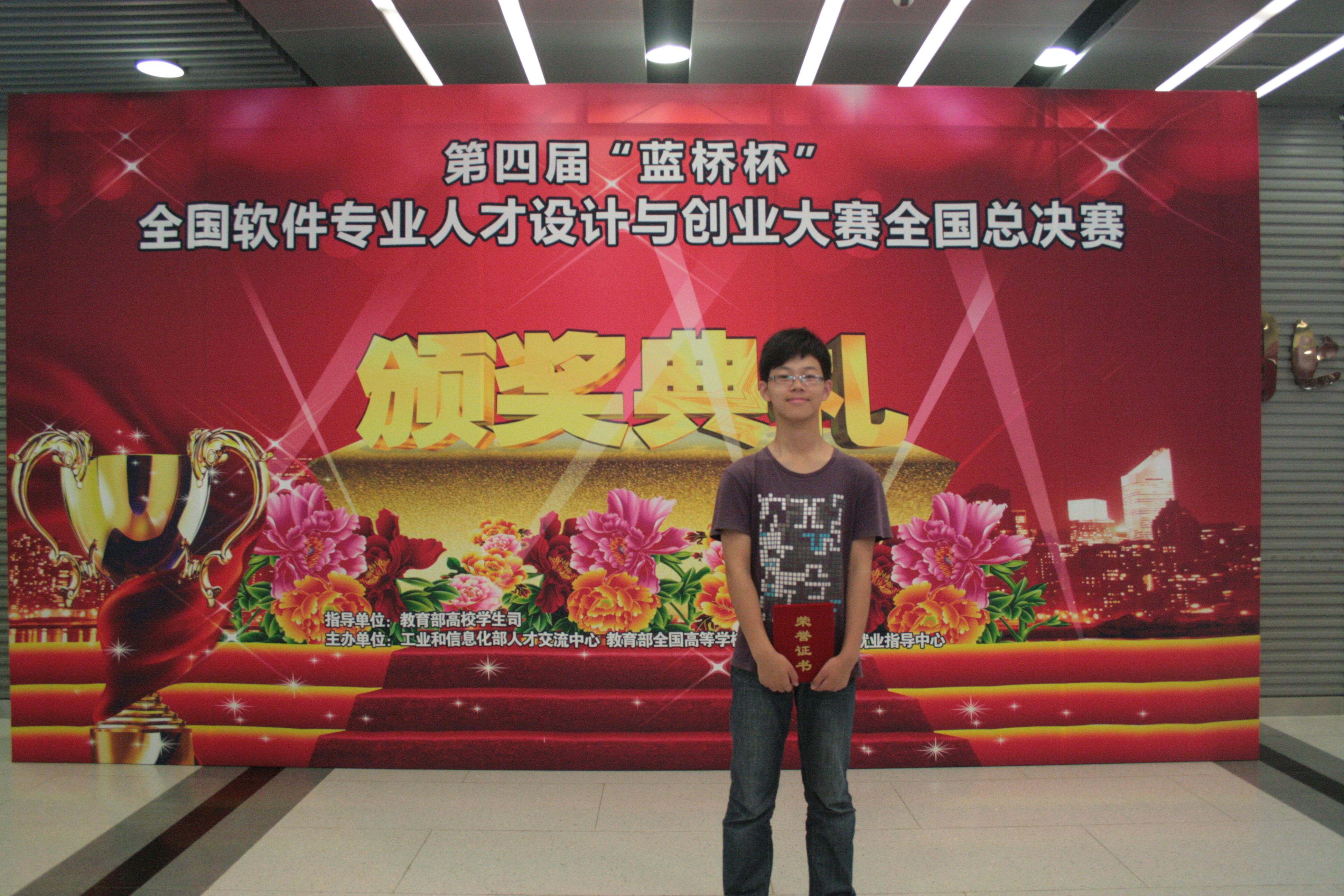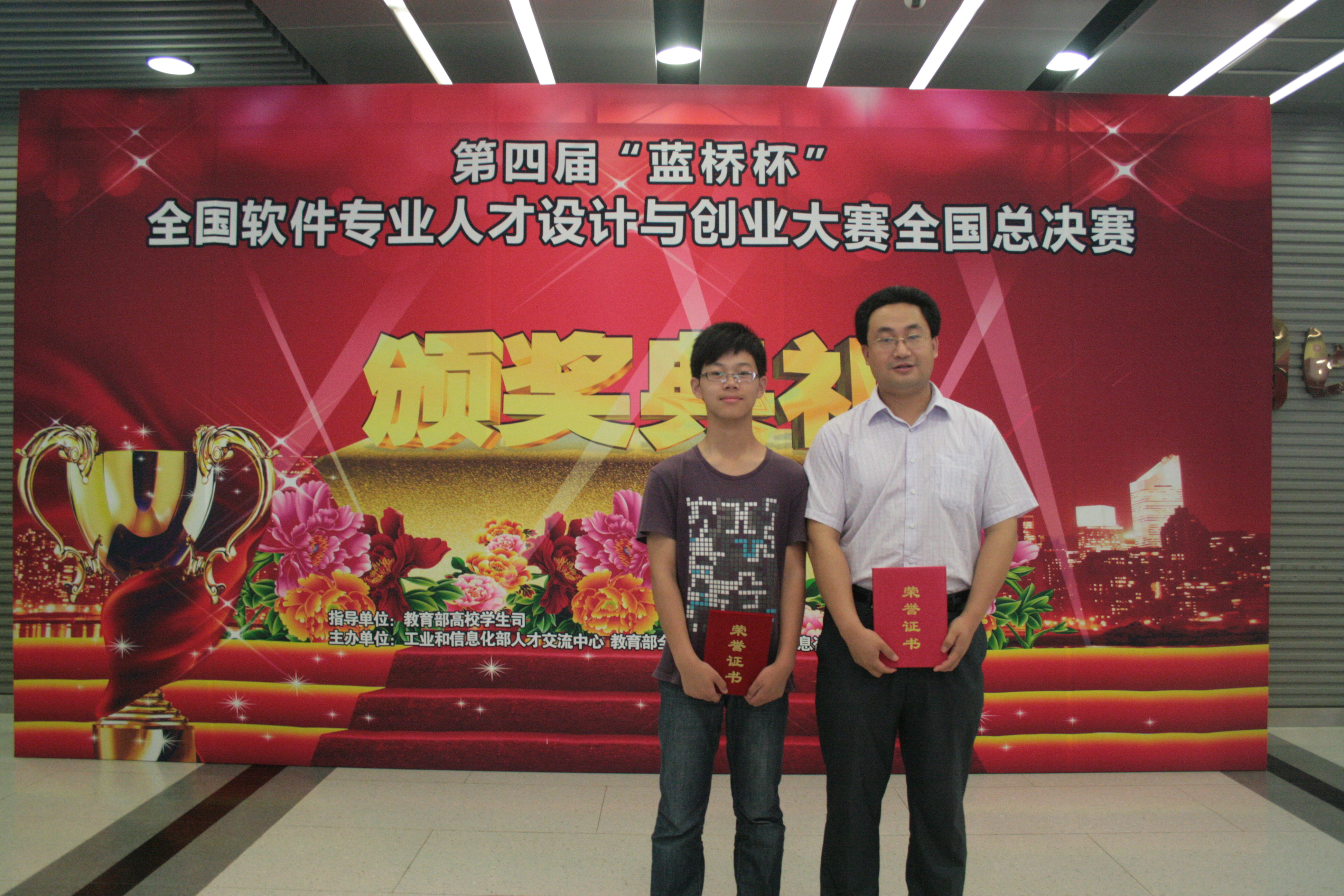 7月13日,第四届“蓝桥杯”全国软件专业人才设计大赛在北京大学体育馆圆满落下帷幕,由菠菜网 李建波副教授指导的邢召龙同学荣获C/C++程序设计B组总决赛全国一等奖,我校荣获“成绩优胜学校”及“优秀组织单位”称号。