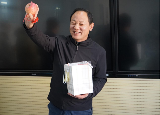 张磊为同学们展示了“一研为定”考研大礼包。其中,“研”途有你加油包装有考试专用涂卡笔、中性笔、固体胶棒、尺子、橡皮等考试用品;橙子寓意心想事成,苹果寓意开花结果,心想事“橙”和开花结“果”为同学们加油鼓劲,愿同学们携手上岸;“越努力越幸运”“逢考必过”“未来可期”等祝福语卡片表达了对同学们的美好祝福。