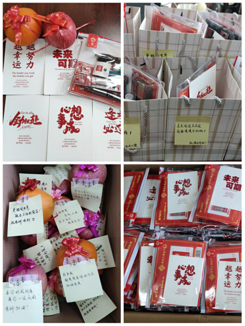 辛克恒、姜彬、陶晓赟及学生会成员为同学们送上“一研为定”考研大礼包和老师、学弟学妹亲手写的祝福。一份温暖的礼包,凝聚着菠菜网