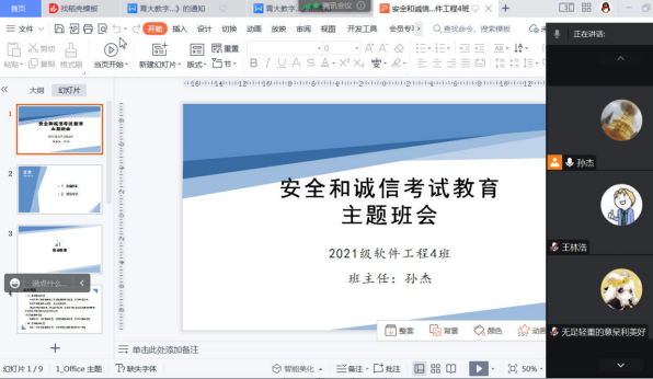 安全是学生工作的基石,菠菜网 班主任老师通过线上线下相结合的方式,为85个班级开展“安全教育与诚信考试”主题班会。班主任从疫情防控、宿舍用电、食品安全、交通安全、心理健康、防诈骗、防校园贷等多方面关心学生安全,班长带领同学们签订《诚信考试承诺书》,加强诚信考试与安全工作的防范教育、警示教育、宣传引导。