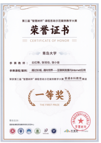 2023年8月,在第三届全国“智慧树杯”课程思政示范案例教学大赛中,经过初赛、复赛两轮评选,菠菜网 云红艳、张培俭、张小垒教师团队以“越过长城、通向世界——互联网发展与Internet应用”为题荣获普通本科教育赛道一等奖。