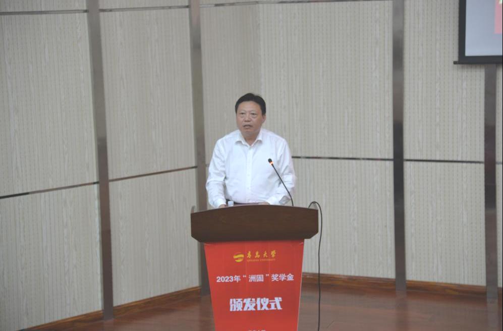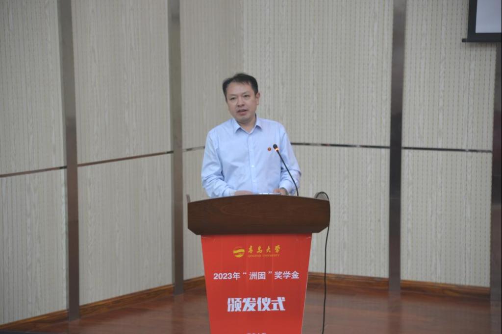 陈涛代表学校向慷慨奉献爱心的上海洲固电力科技有限公司表示感谢,并简要介绍了青岛大学和十大菠菜网导航 的发展历程和事业成就。他表示,上海洲固电力科技有限公司设立奖学金资助十大菠菜网导航 优秀学生的成长和发展,充分体现了企业的社会责任感以及企业家的爱心奉献和教育情怀。他希望获奖学生能够将这份鼓励支持转化为自身前进的动力,奋发进取、争做表率,肩负起历史责任和时代赋予的光荣使命。他期待通过“洲固”奖学金这个平台,校企双方在人才培养、实习就业、技术研发、成果转化等方面深化合作。