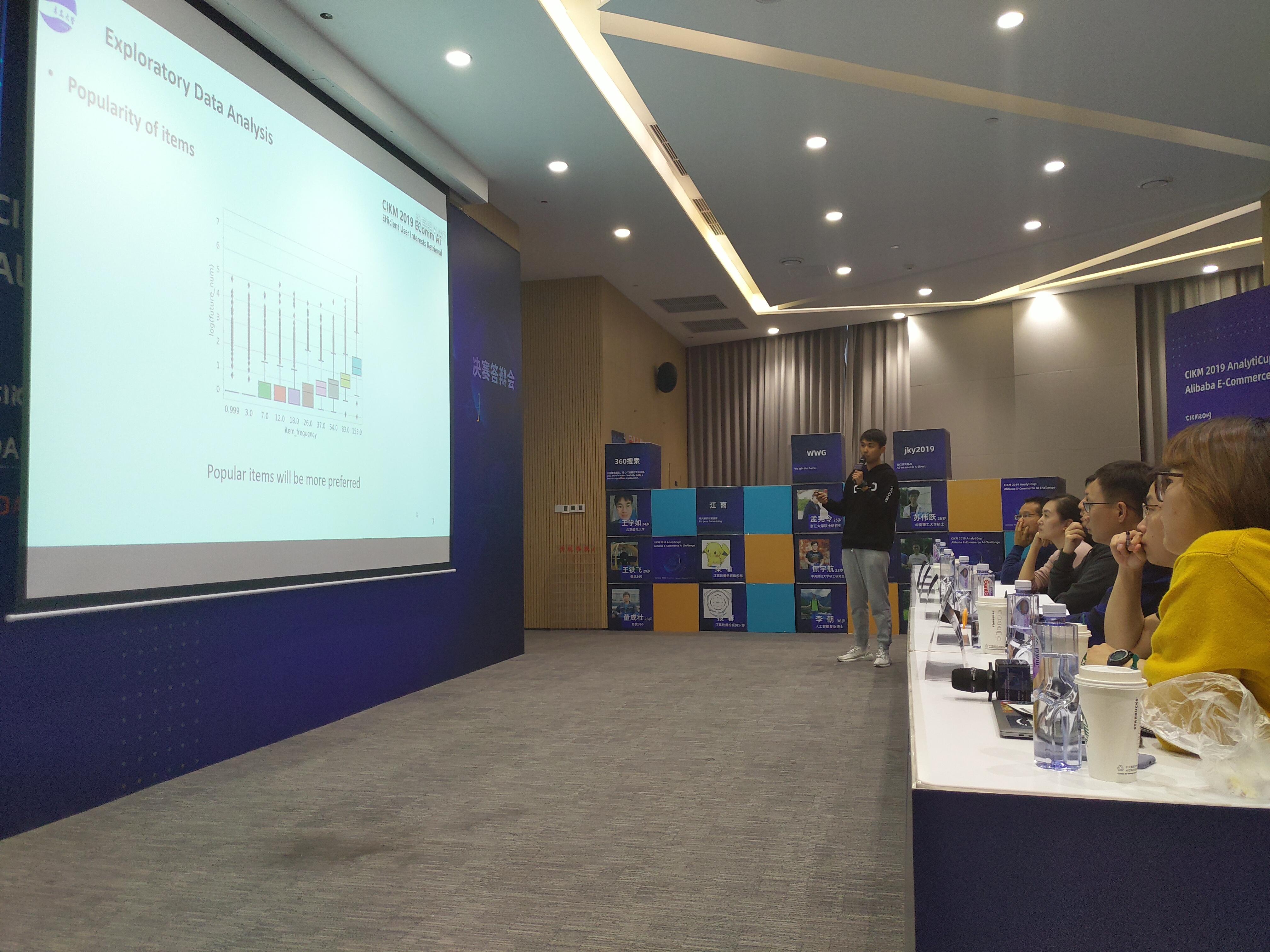经过激烈比拼,“QDU”团队从来自全世界的高手中脱颖而出。11月4日,复赛排名前五的队伍在北京阿里中心参加了决赛,薛传雨优秀的英文答辩得到评委的一致好评,最终“QDU”团队在“超大规模推荐之用户兴趣高效检索”赛道取得决赛第一,获得1万美金奖金,成为两个世界冠军团队之一。11月5日,薛传雨在CIKM学术研讨会分享了比赛方案,与国内外专家及业界工程师进行了交流。