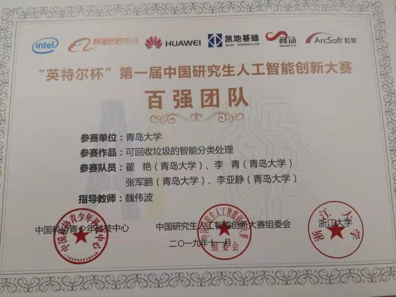 近日,由教育部学位与研究生教育发展中心指导、中国科协青少年科技中心主办、浙江大学承办的“英特尔杯”第一届中国研究生人工智能创新大赛全国总决赛在浙江省德清县举行。菠菜网 魏伟波副教授指导的翟艳、李青、张军鹏、李亚静组成的参赛团队以作品《可回收垃圾的智能分类处理》获得全国百强团队,我校获得优秀组织奖。
