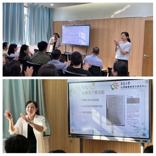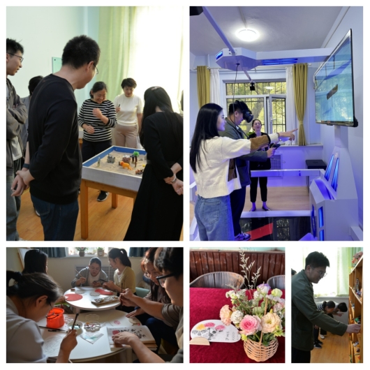 心理健康教育与研究中心主任米振宏首先向老师们介绍了中心秉承的工作理念“用专业温暖每一个心灵,让生命在此绽放”,然后带领老师们有序参观了预约接待室、艺术治疗室、团体活动室、VR训练室、沙盘游戏室、心理测评室、宣泄室等功能室。米主任结合自身工作经验从心理学入手,列举典型案例,深入浅出地讲解了师生心理健康的重要性以及青少年常见心理问题及应对,亲切又富有感染力的讲解引起了大家的情感共鸣,对于老师们在处理学生常见心理问题及人际关系矛盾的问题上有很大的帮助。讲座结束后,老师们详细观摩并体验了插花、绘画、沙盘、SWITCH等相关功能室及活动。