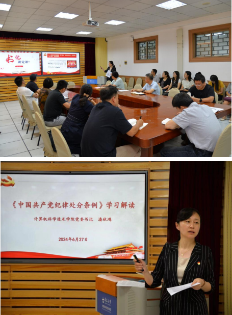 6月27日下午,院党委书记潘秋鸿在博知楼510会议室为菠菜网 党员讲授党纪学习教育专题党课,解读《中国共产党纪律处分条例》(以下简称《条例》)。院党委领导班子成员、各党支部书记和委员、院机关支部党员、学生党员代表等参加学习。