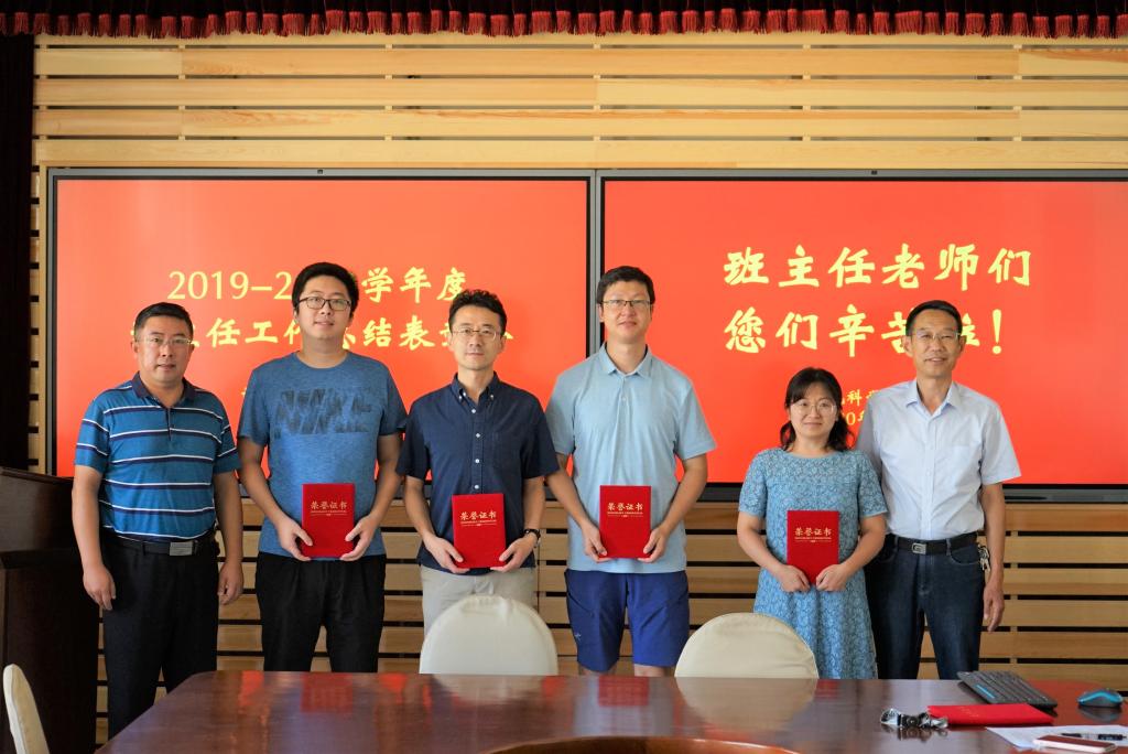 武绍学、周鹏为获得菠菜网 2019-2020学年度“优秀班主任”称号的李琳、赵毅、高磊、杨环、张翰林等五位教师颁发荣誉证书。