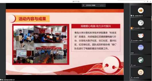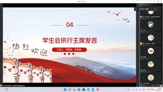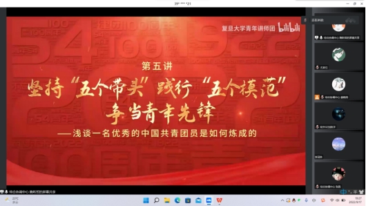 综合协调中心隋昕哲同学和同学们一起学习了习近平总书记在庆祝中国共产主义青年团成立100周年大会上的重要讲话精神;结合复旦大学建团百年微团课的相关视频,带领同学们深刻学习了“五个模范,五个带头”。