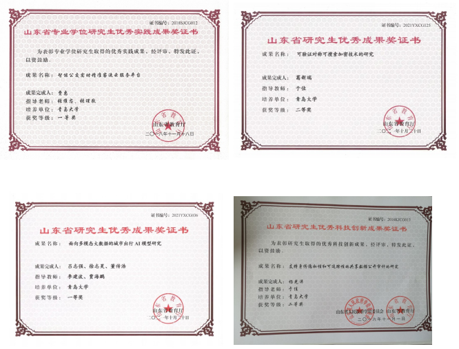 研究生培养成果。“十三五”以来,研究生发表论文679篇,其中高水平论文298篇,6篇论文获评山东省优秀硕士学位论文,1人获评全国工程硕士实习实践优秀成果,8人获山东省研究生优秀成果奖;招收、培养“一带一路”沿线国家硕士、博士研究生14人,6名研究生赴美国特拉华大学、英国兰开夏大学访学交流3个月,与瑞典布莱京理工菠菜网 联合培养研究生10人,国际化人才培养特色鲜明。研究生在中国高校计算机大赛、“互联网+”大学生创新创业大赛、中国虚拟现实大赛、虚拟现实技术及应用创新大赛、CCF大数据与计算智能大赛、全国密码技术竞赛、中国研究生智慧城市技术与创意设计大赛、中国研究生电子设计竞赛、人工智能大赛、全国计算机仿真大奖赛、中国数据挖掘大赛等赛事获得多项奖励。