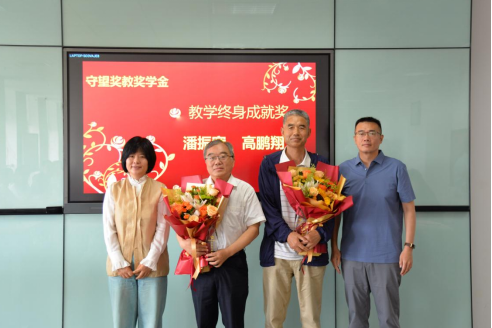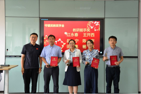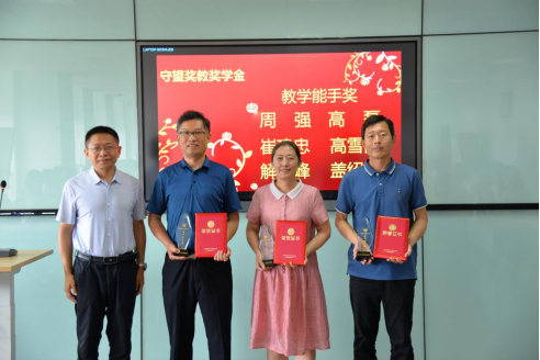钱勇、龚超、王丽燕、陈鹏四位校友分别为“教学能手奖”获得者高磊老师、周强老师、崔建忠老师、高雪霞老师、解新峰老师、盖绍婷老师,“教研能手奖”获得者江永春老师、王开西老师、赵宁老师、陈宇老师、田呈亮老师、杨环老师,“终身成就奖”获得者潘振宽老师、高鹏翔老师颁发奖杯及荣誉证书。